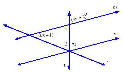 Step-by-step explanation: So we have four different lines intersecting at one point or the other and these are lines m, n, s and t. Also lines m and n are parallel, so we shall start from there. If lines m and n are parallel, then angle 74 along line n is equal to angle 9X + 2 along line m {corresponding angles are equal}. Therefore