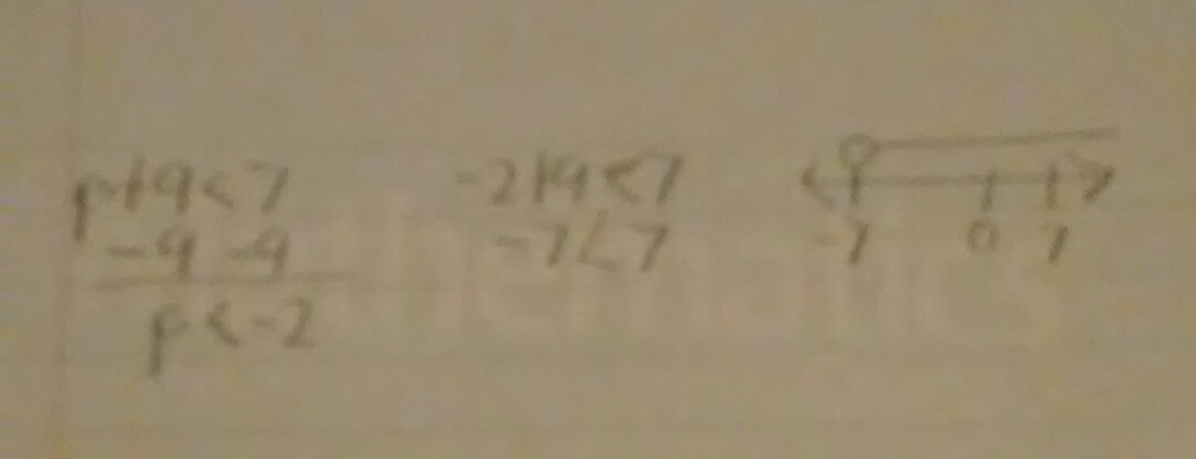 all you have to do is rewrite the problem cancel 9 out because 9 - 9 equals zero you put P there instead of zero and then you put the less than sign and then you do it 7-9 and that gives you -2 after that right next to it you substitute and put -2 for p and you do -2 + 9 is less than 7 and then right next to where I graphed it