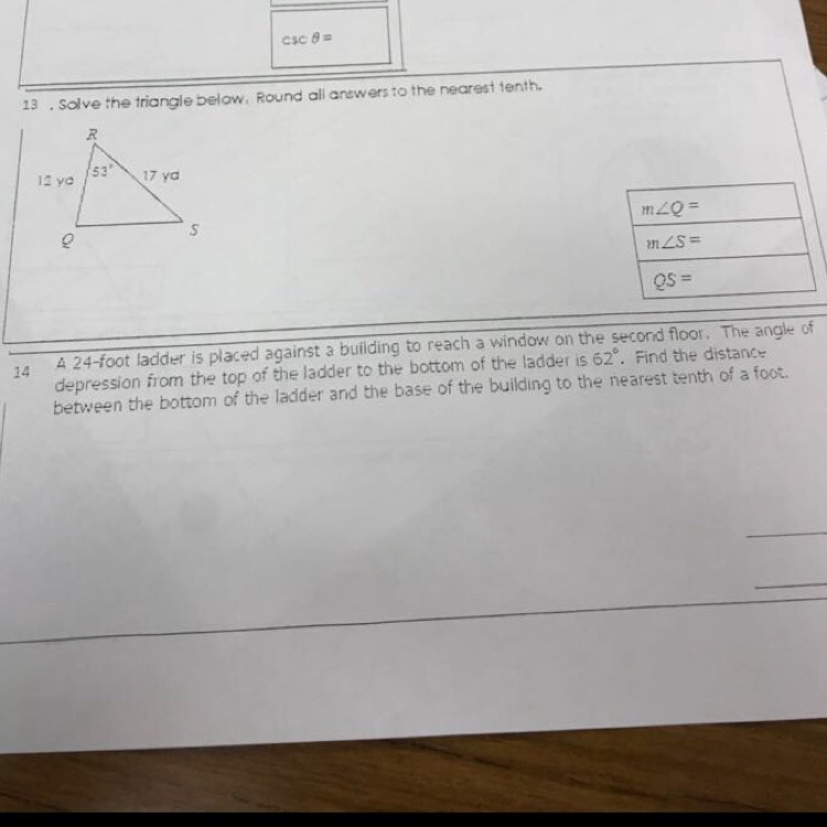 for question 14, we establish that the angle of depression is in that spot there that forms with the dashed lines. then we can say that angle is the same as that angle in the triangle that forms with the ladder. then, since that's a right angle, we use cosine to find the length between the bottom of ladder to the wall