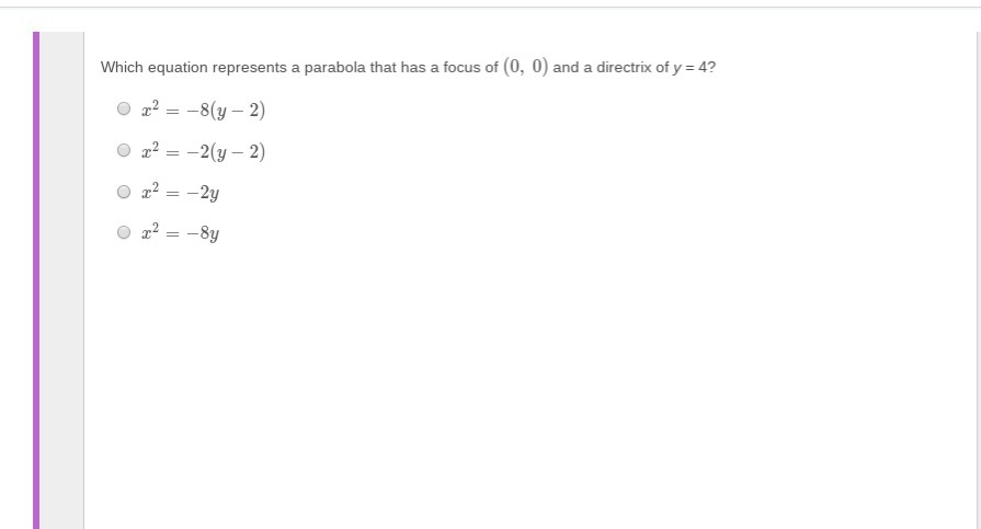 x²+2. None of the answers are in this particular form, though. The entire equation is multiplied by -8 to produce -8y = x²-16. 16 is added on both sides to get x² = -8y+16. This is simplified to x² = -8(y-2), and we can see that the answer is the first option.