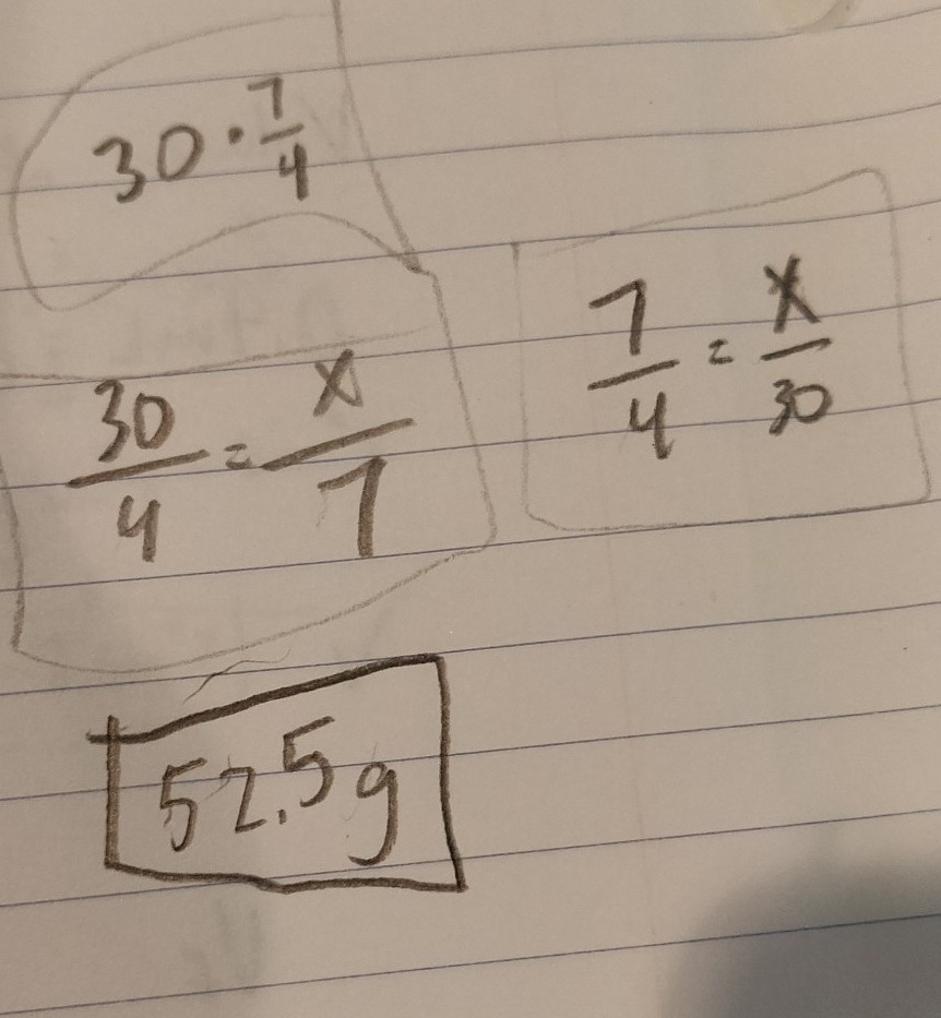 there are many ways to solve with ratios between sugar and number of cakes, idk if you know how to do that, but any way you do it the correct answer is 52.5g
