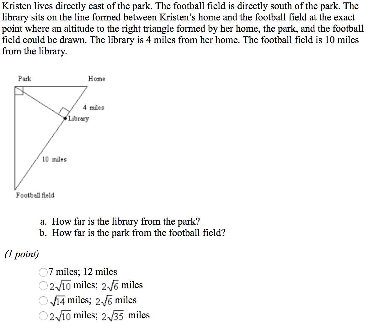 The last answer ⇒ 2√5 miles , 2√35 miles