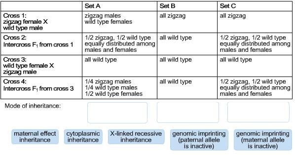 Suppose a graduate student is studying a loss-of-function mutation in the mouse gene zigzag. Whereas wild type mice have straight tails, zigzag mutant mice have tails with two sharp kinks, so that the tail looks like the letter Z. To determine how the zigzag phenotype is inherited, he performs the crosses listed in the first column of the table below, using parents from true-breeding lines. Three possible sets of results from these crosses are shown. Determine the mode of inheritance of the zigzag gene that would yield each result set.