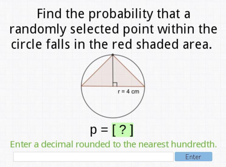 The probability that a randomly selected point within the circle falls in the red shaded area will be : P(area of shaded part/area of circle)
