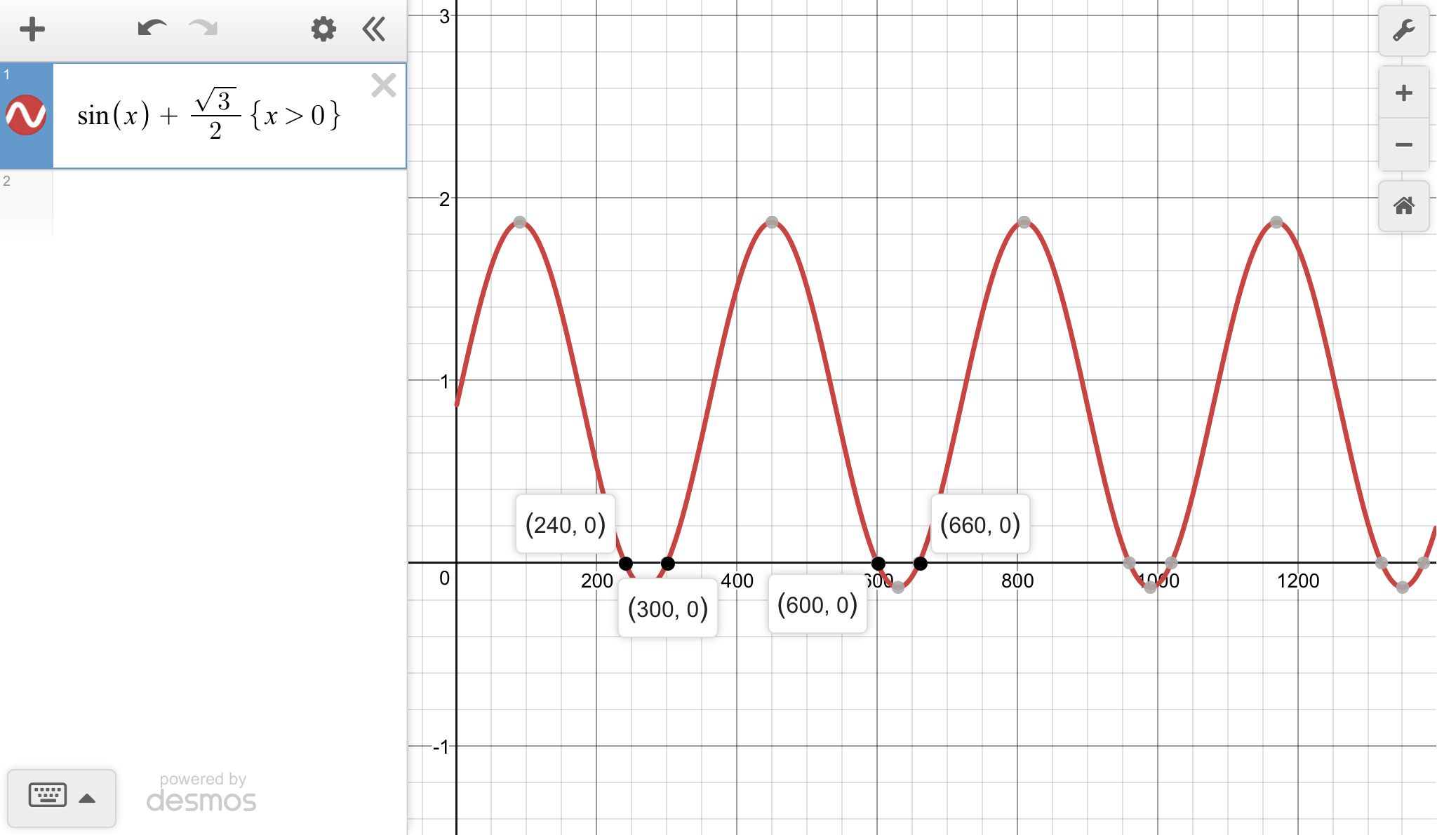 The sine will be negative for angles in the 3rd and 4th quadrants whose reference angle is 60°. Those angles are 180°+60° = 240°, and 360°-60° = 300°. These are two of your solutions. You can add 360° to either of them to find another solution: 240°+360° = 600°, for example.