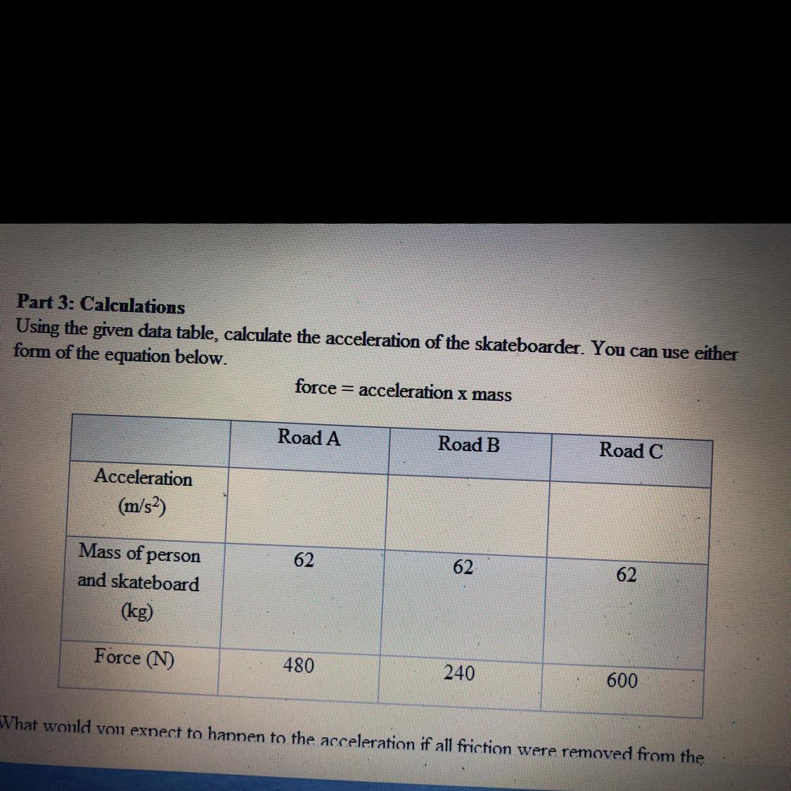 The acceleration of the skateboarder on road A, road B and road C is 7,75 m/s² , 3,87 m/s² and 9,68 m/s².