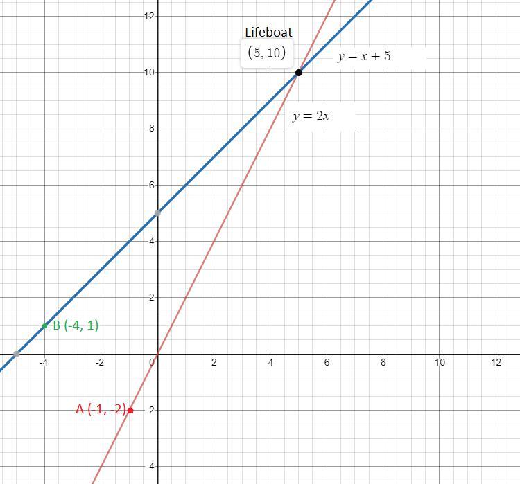 This problem models a system of linear equations, because we need to find the coordinates of the lifeboat, which is a common points for both ships. So, basically, we just need to find the solution for the system formed by both equations.