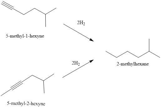 If we use the info given we have a band a 3300 cm-1 and 2200 cm-1 this indicates that we have an <u>alkyne functional group</u>. Additionally, the hydrogenation of the unknown molecule will consume two moles of hydrogens this fits with the <u>2 pi bonds</u> in the alkyne functional group. So, we can <u>discard "a" and "e"</u>. The product of this hydrogenation is 2-methylhexane therefore we can <u>discard c</u> because the methyl group is placed on carbon 3. Structures b and d can work.