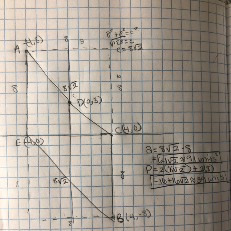 Find the area and perimeter of a polygon with vertices located at A(-4,-8), B(4, -8), C(4, 0), D(0, 3), and E(-4,0).