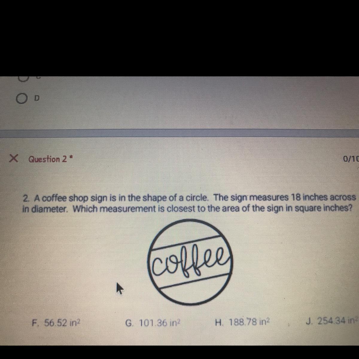 area = pi * radius ^2 = pi * 9*9 = 254.34