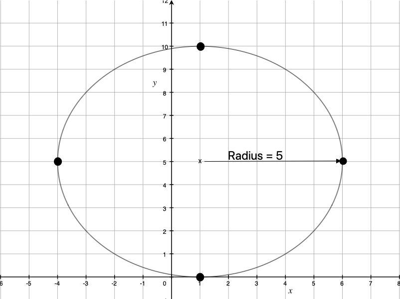 To graph the circle, place an x at the center (1, 5). Plot a point 5 units (the radius) to the right of the center, another point 5 units up from the center, a third point 5 units left from the center, and a fourth point 5 units down from the center. "Connect the dots" to create a circle.