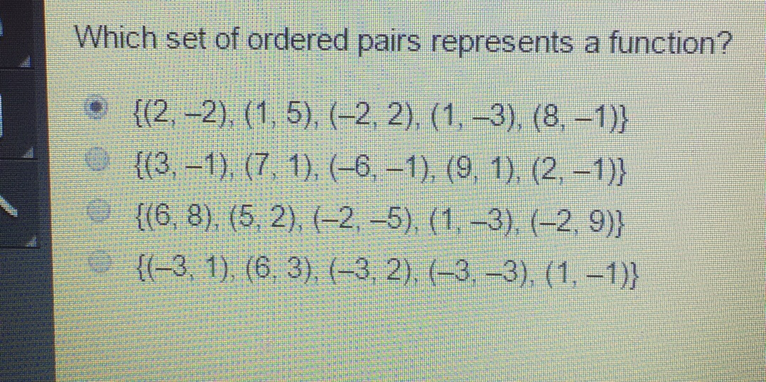 A function given a set of ordered pairs, make sure that the x element corresponds only to one y element.