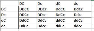 1. The Punnett square should be laid down in a table of two entries. On the top entry, the possible alleles of one of the parents, and on the other entry, the possible alleles of the other parent, which will be the same as both have the same genotype. The possible alleles for both parents would be: DC, Dc, dC, and dc. On the actual table's body, all alleles should be crossed from one entry and the other obtaining the possible genotypes of the offspring and their proportions, and, therefore, the possible phenotypes and their proportions.