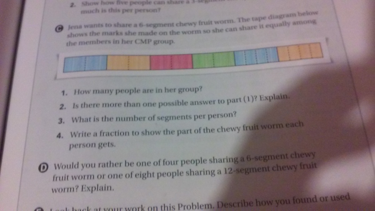 2. There are other possibilities. Those are 2 and 4 people. In the 4 people scenario, each person receives 2 big parts (from the start of the worm) and 2 small parts (from the end of the worm). In the 2 people scenario, each person receives 4 big parts (from the start of the worm) and 4 small parts (from the end of the worm).