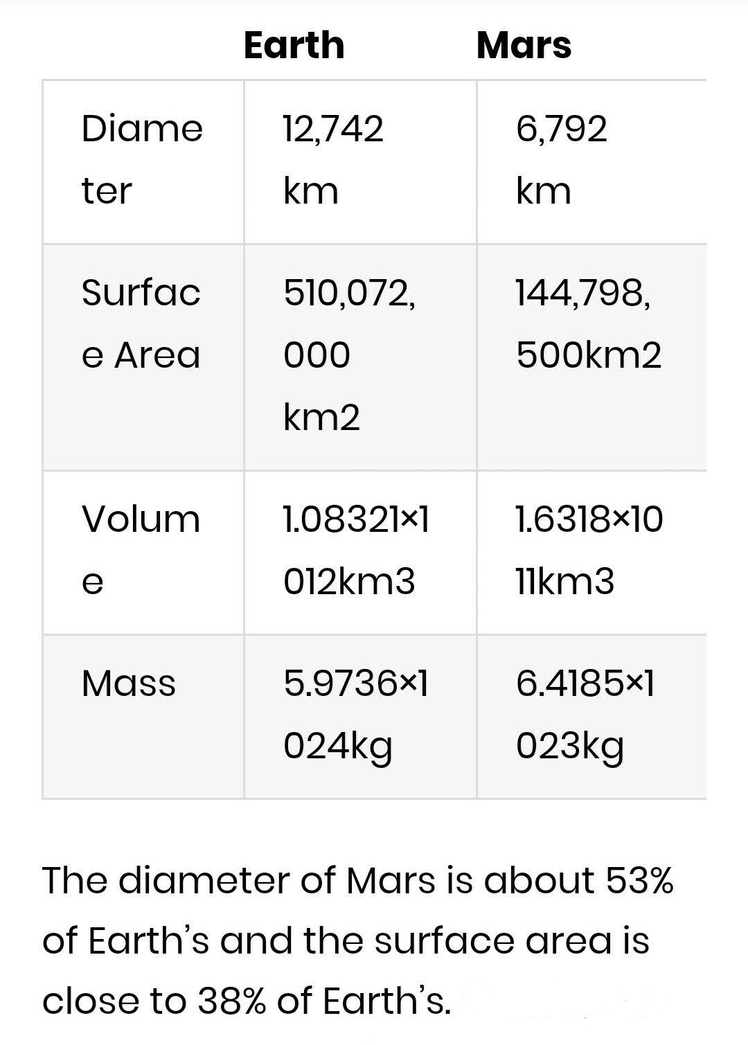 As you can see from the above statistics, Mars is as a matter of fact smaller in size than planet Earth. In fact, the diameter of Earth is almost twice the diameter of Mars.