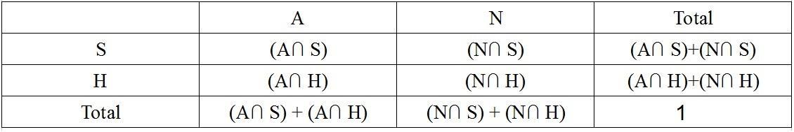 P(A)= P(A∩S)+P(A∩H)= 0.0045+0.0197= 0.0242