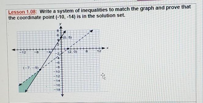 Write a system of inequalities to match the graph and prove that the coordinate point (-10,-14) is in the solution set ​