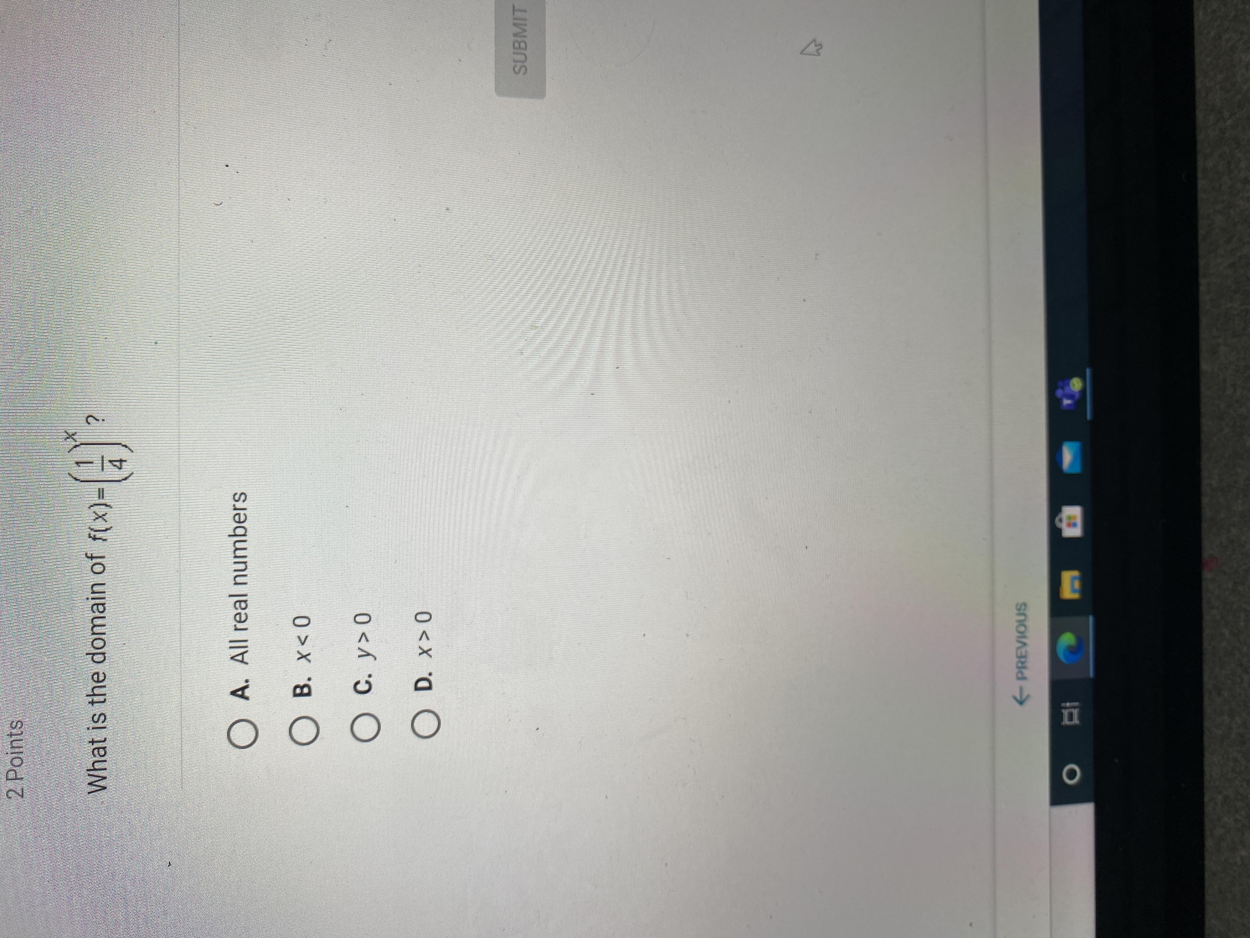 When f(x)=(1/4)^x is graphed, you get a line that extends infinitely in both directions of x