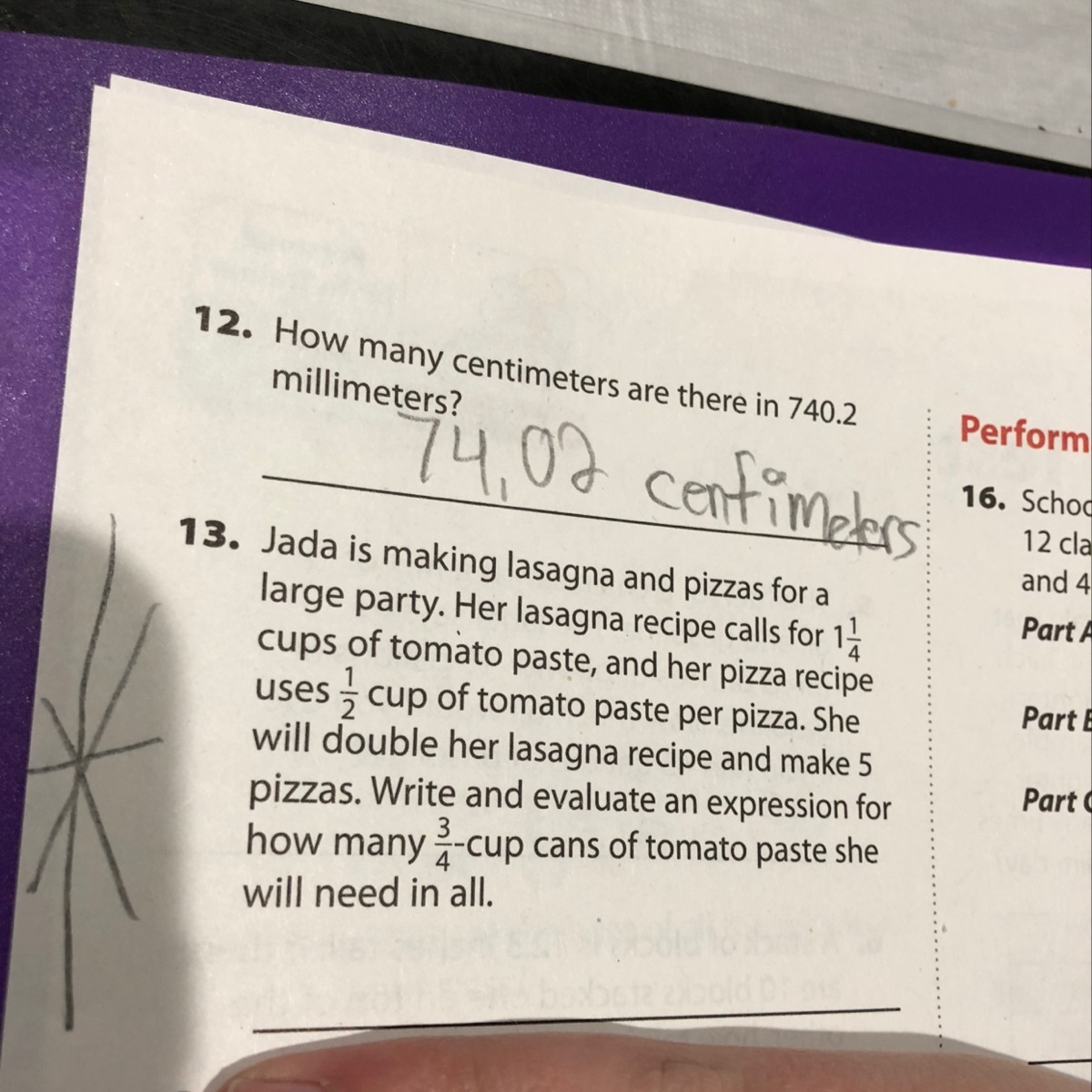 recipe calls for 1 1/4 cups of tomato paste, and her pizza recipe uses 1/2 cups of tomato paste per pizza. She will double the lasagna recipe and make 5 pizzas. Write and evaluate an expression for how many 3/4-cup cans of tomato paste she will need in all. PLEASE DO NOT SHOW WORK! IT ALL CONFUSES ME EVEN MORE!