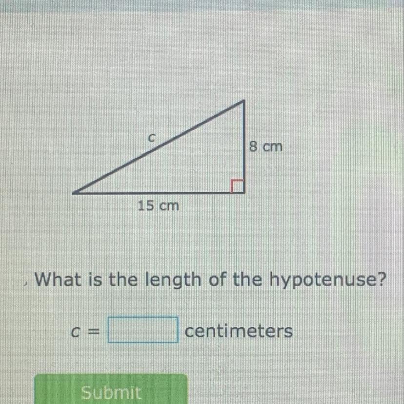 Use the pythagorean theorem: 8^2+15^2=c^2