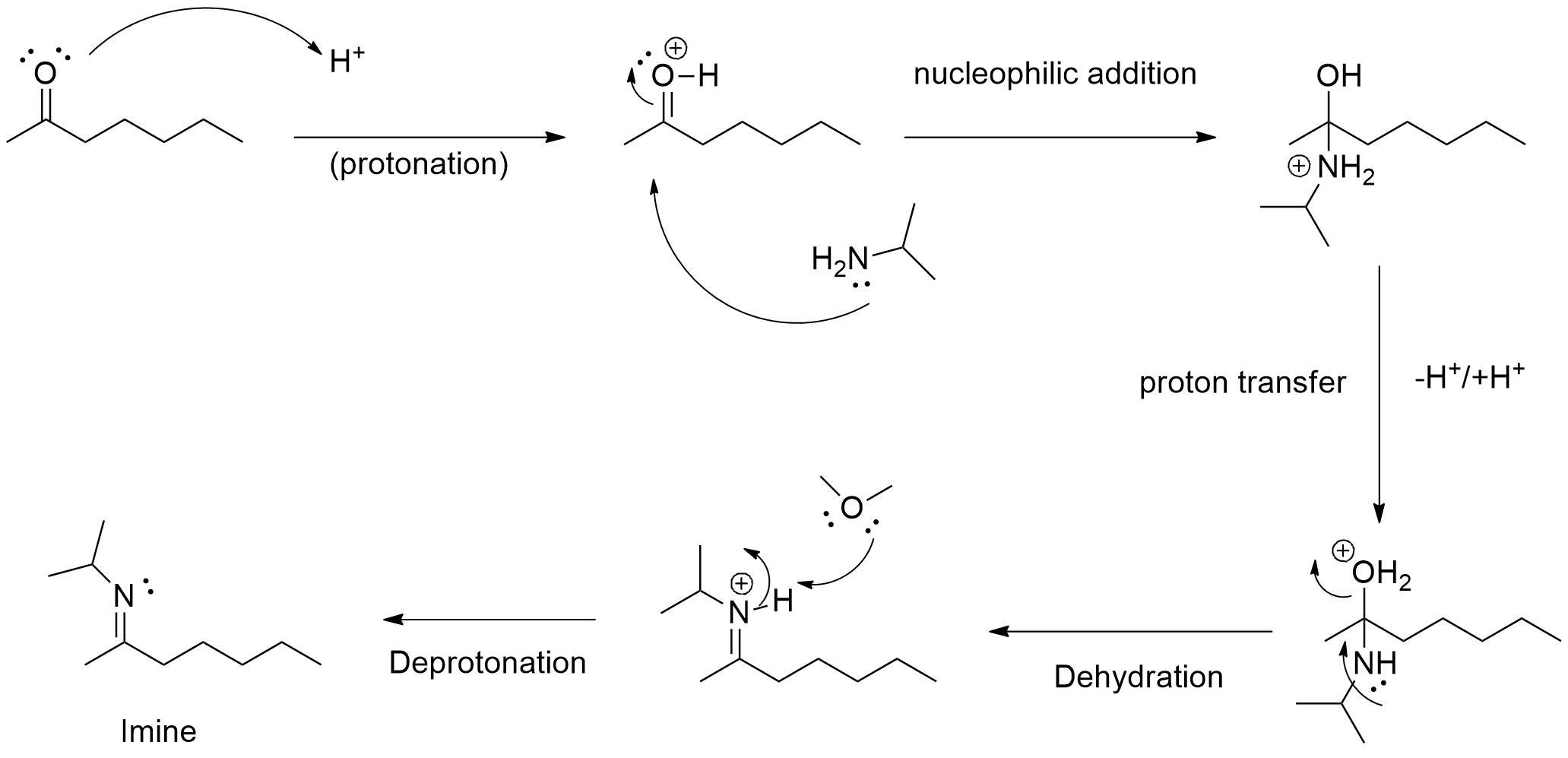 In the first step, protonation of cabonyl oxygen occurs. In the 2nd step, amine gives a nucleophilic addition reaction at carbon center of protonated carbonyl group. In the 3rd step, proton transfer takes place. In the 4th step, dehydration occurs. Lastly, deprotonation leads to formation of an imine.