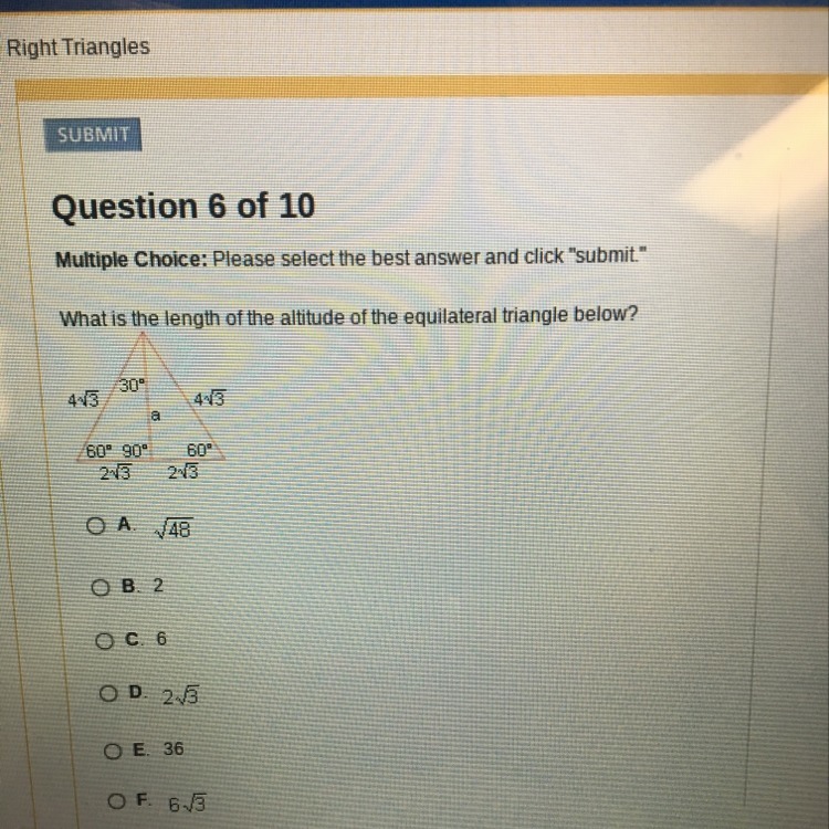 You could use pythagorean theorem to solve the problem. Look at one of the right triangle on the picture, either the right one or the left one. Pythagorean Theorem: The sum of the squares of the perpendicular sides is equal to the square of hypotenuse. a² + (2√3)² = (4√3)² a² + (2√3)(2√3) = (4√3)(4√3) a² + (4 × 3) = (16 × 3) a² + 12 = 48 a² = 48 - 12 a² = 36 a = √36 a = 6