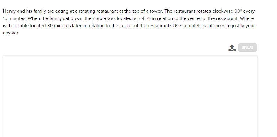 nutes. When the family sat down, their table was located at (-4, 4) in relation to the center of the restaurant. Where is their table located 30 minutes later, in relation to the center of the restaurant? Use complete sentences to justify your answer. PLEASE HELP I AM SO CONFUSED AAH