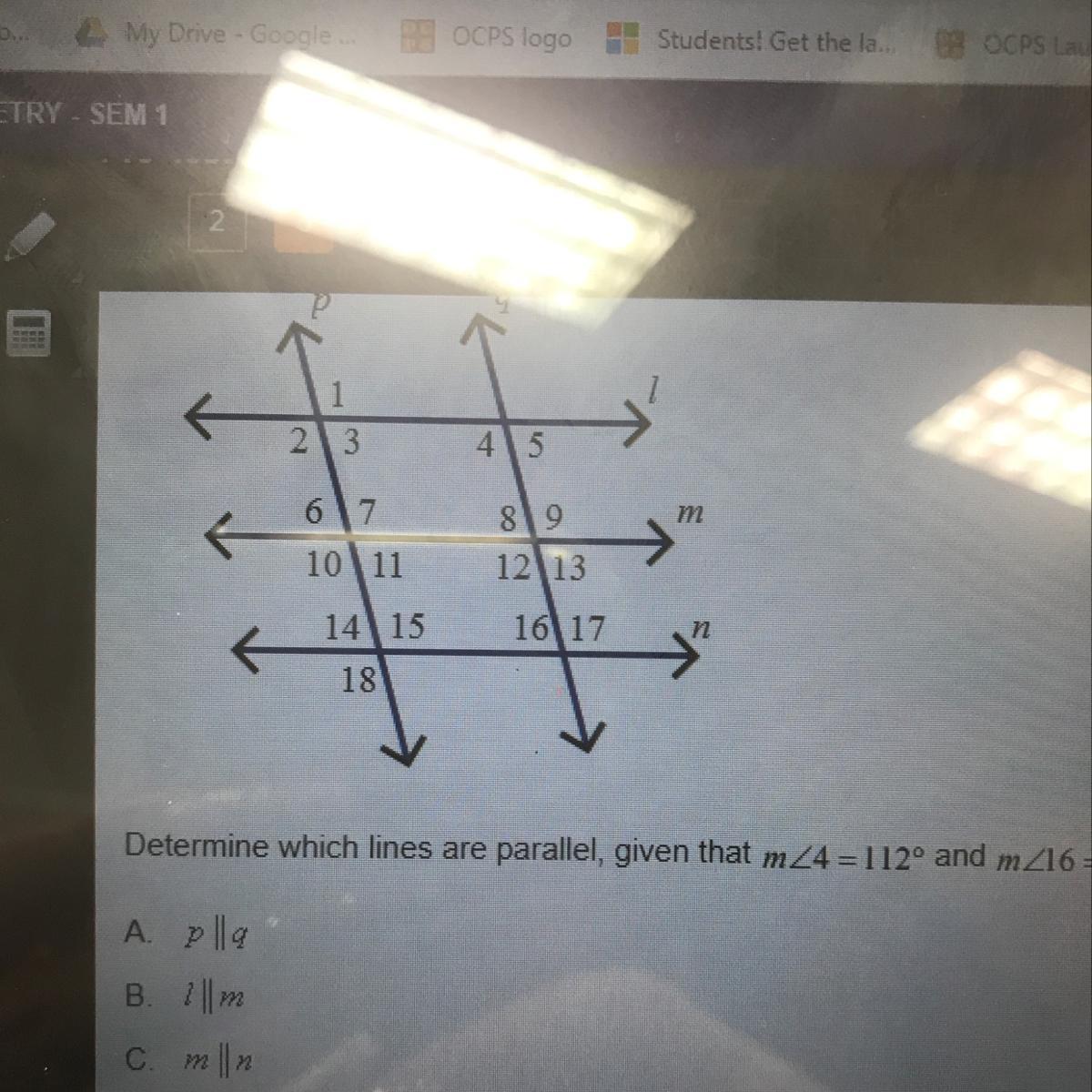 Answer: lines l and n are parallel (is that choice D.?)