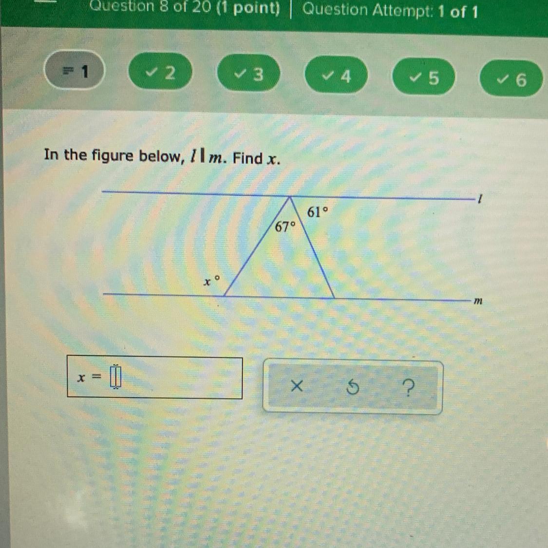 Because since it didn't say what one of the angles of the triangles were. I think they were just expecting you to assume that both of the missing angles of the triangle are the same. So, since the sum of a triangle equals 180°, you would do 180°- 67°, which equals, 113°. Then since you are trying to find what x° equals... You would do 113° ÷ 2, to find the two missing angles of the triangle, which equals 56.5°. So, now you know that each angle of the triangle equals 56.5°. And before I go on, just incase you don't know, a straight angle is 180°. So, since x° is on a straight angle... you would do 180°- 56.5°, which equals, the angle x°. So, x° equals 123.5°. Now, 123.5° might not be the right answer, only because in the problem it includes 61°... and I don't know why or what to do with that. So, hopefully 123.5° is the correct answer. I would try 123.5°, if not than I am sorry. But it does seem reasonable, since x° has to be more than 90°, but also less than 180°.
