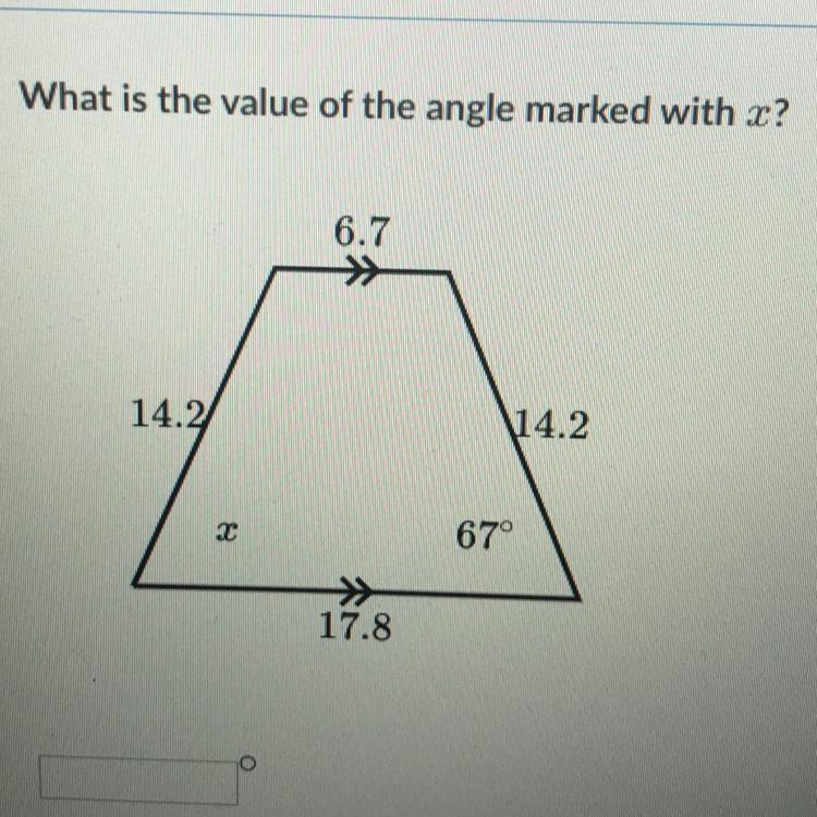 This is an isosceles trapezoid because the opposite sides are the same length 14.2. The base angles of an isosceles trapezoid are equal so x = 67°.
