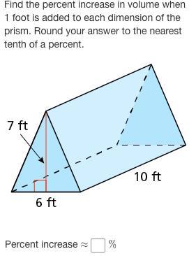 First we find the volume of the triangular prism. We find the area of the triangle, then we multiply that by the height. So 7*6/2= 42/2=21 21*10= 210 Then if all the dimensions add another foot on to them then you get: 7, 8, and 11. Then you do the same thing to find the area of this rectangular prism. 7*8/2=56/2=28 28*11= 308 Now, we calculate the growth from 210 to 308 in this proportion: 308/210=x/100 Solving it we get (cross multiplying): 210x=30800 x=146 2/3 or 146.66 percent increase. I hope this helps!