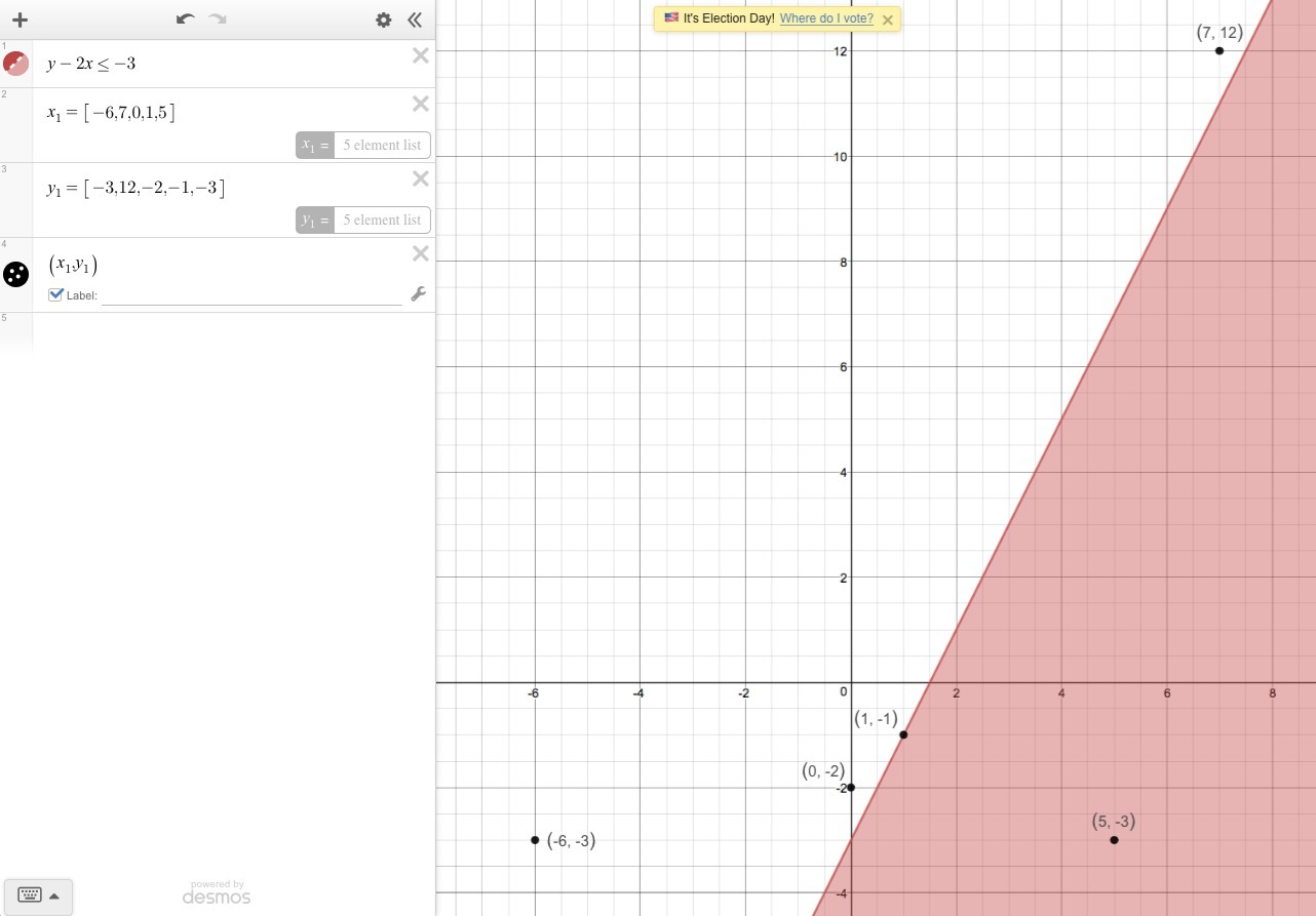 ... {-3, 12, -2, -1, -3} - 2×{-6, 7, 0, 1, 5} ≤ -3 . . . . . use lists for x and y values