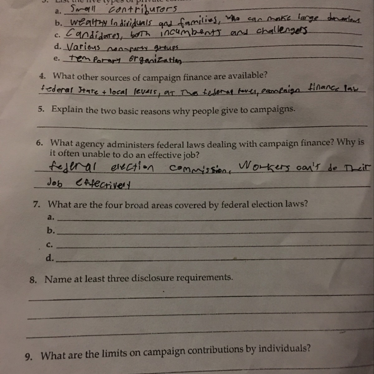 7. This one is a little bit copied so change it a bit. Timely disclosure of campaign data, place limits on campaign donations, place limits on how much a campaign can spend, and provide public funding for parts of the election process.