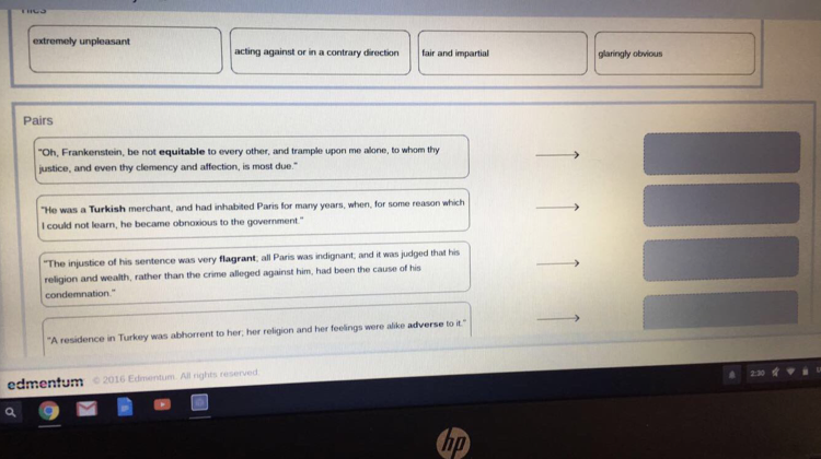 “Oh Frankenstein, be not equitable to every other and trample upon me alone, to whom thy justice, and even thy clemency and affection, is most due." - equitable here means <em>fair and impartial</em>.