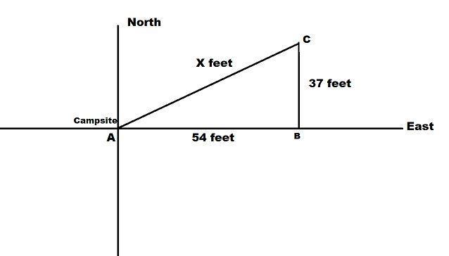 Given, Abby went camping with her family. She left her campsite to look for firewood. She walked 54 feet east and then walked 37 feet north .