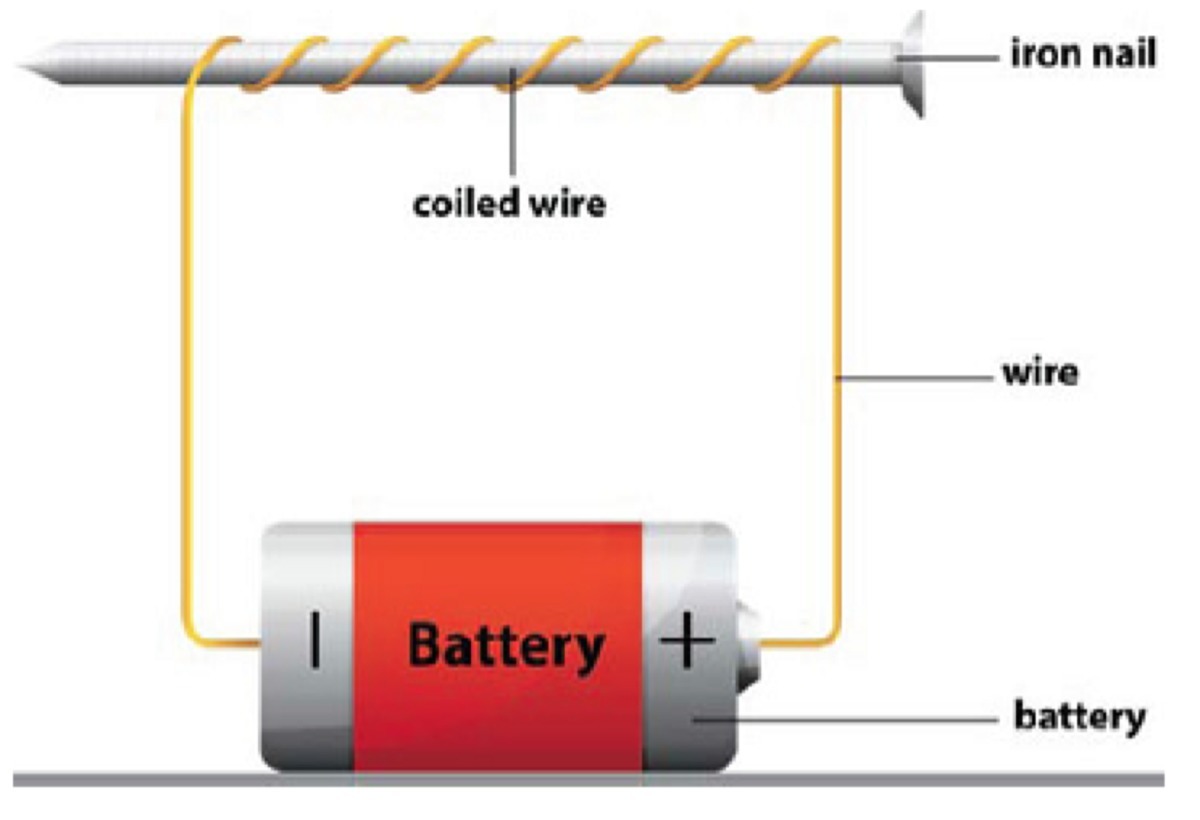 The given diagram shows an electromagnet. A iron nail is placed between coil through which current is passes as it is connected to the battery.