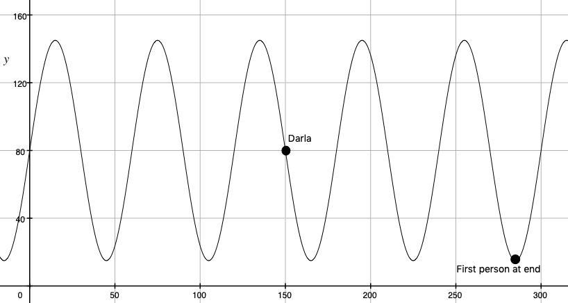 B = 60 the person next to Darla is 10 yds (30 ft) --> Period = 60