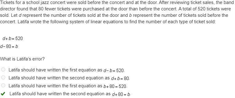 The correct answer is <u>D</u>, Latifa should have written the second equation as <u>d+80=b</u>