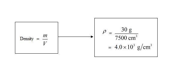 Density, sample of gas, 30g gas, volume, 7500 cm3, 7500 cm^3, mass, matter, volume occupied, sample, ratio,grams per centimeter cube