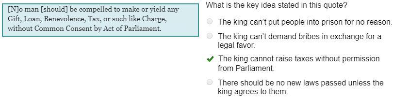 The king cannot raise taxes without permission from Parliament.