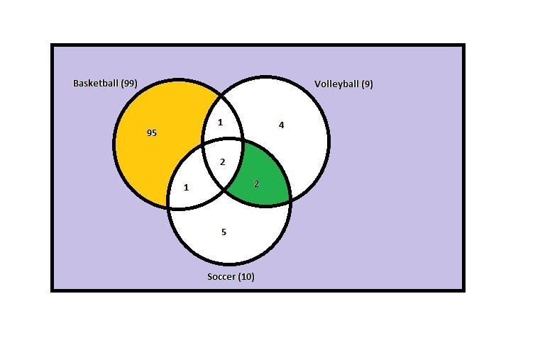 and soccer​ only, 2 played volleyball and soccer​ only, 1 played basketball and volleyball​ only, and 2 played​ volleyball, basketball, and soccer.