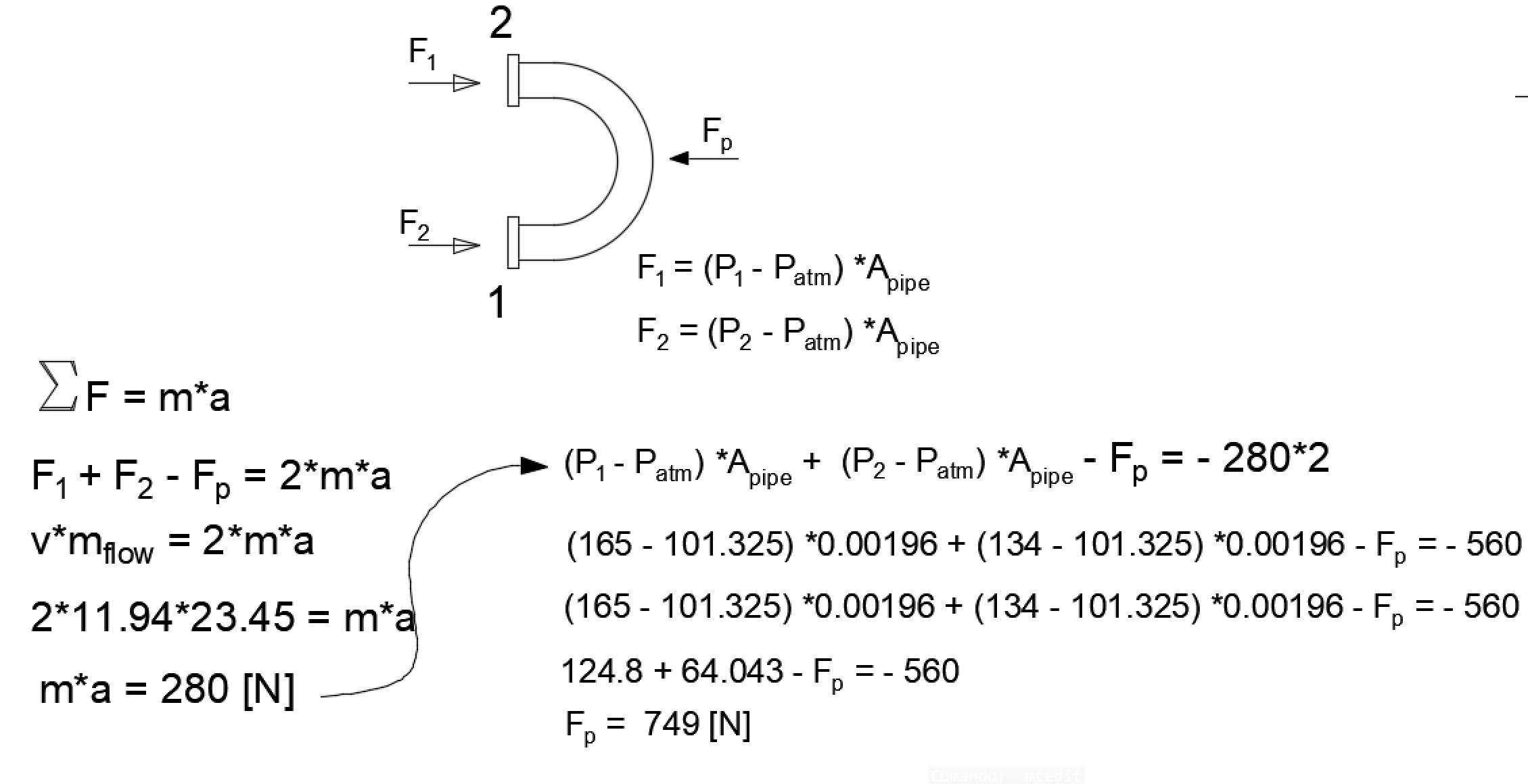 We must make a U-shaped body diagram of the pipe in order to visualize the forces acting according to the pressures and the area of the pipe.