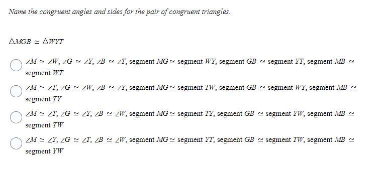 The segments pair up in a similar fashion. For instance, M and G are the first two letters of MGB, W and Y are the first two letters of WYT, so segment MG and WY pair up and are congruent. The other segments follow that pattern as well.