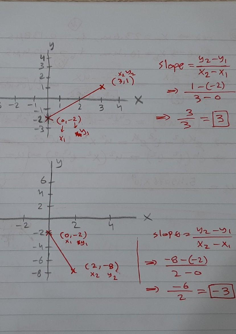 The slope of a line that contains the points (0, -2), (3, 1) is 1 and points (0.-2), (2.-8) is -3