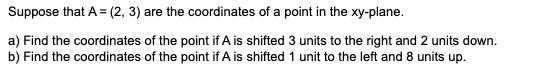 given A is (2,3), question a is represented by a shift of this point 3 units to the right, and 2 units down which means (x,y) → (x +3, y - 2) or T(3,-2)(x,y). (2,3) → (x + 3, y - 2) = (2 + 3, 3 - 2) = (5, 1).