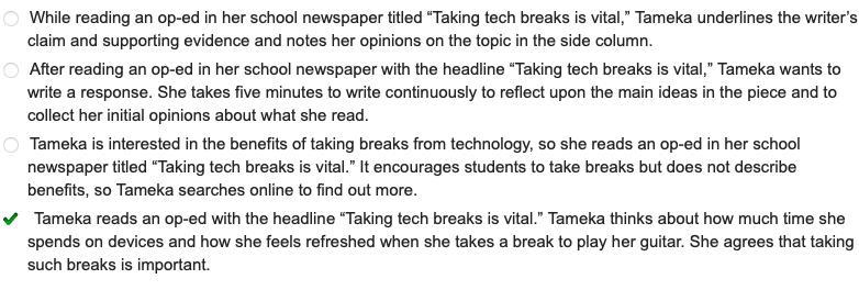 r titled “Taking tech breaks is vital,” Tameka underlines the writer’s claim and supporting evidence and notes her opinions on the topic in the side column. After reading an op-ed in her school newspaper with the headline “Taking tech breaks is vital,” Tameka wants to write a response. She takes five minutes to write continuously to reflect upon the main ideas in the piece and to collect her initial opinions about what she read. Tameka is interested in the benefits of taking breaks from technology, so she reads an op-ed in her school newspaper titled “Taking tech breaks is vital.” It encourages students to take breaks but does not describe benefits, so Tameka searches online to find out more. Tameka reads an op-ed with the headline “Taking tech breaks is vital.” Tameka thinks about how much time she spends on devices and how she feels refreshed when she takes a break to play her guitar. She agrees that taking such breaks is important.