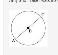 In the image the diameter of the circle is the segment AC, whereas the radius of the center is either the segment AB or the segment CB. Since Amy walks from pint A to point B, she walks a distance equal to the radius of the center. Fraser on the other hand walks the entire diameter of the circle since he walks form point A to point C.