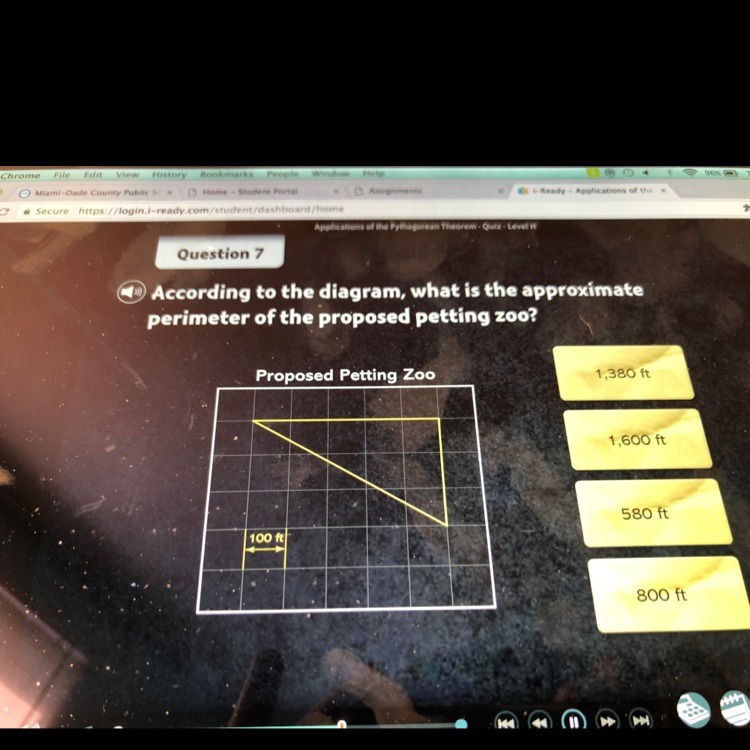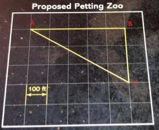 Given : A triangle showing proposed petting zoo with grid length = 100 ft