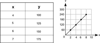 ns and 5 rows is shown. The column head for the left column is x, and the column head for the right column is y. The row entries in the table are 4 comma 100 and 5 comma 125 and 6 comma 150 and 7 comma 175. On the right of this table is a graph. The x-axis values are from 0 to 10 in increments of 2 for each grid line. The y-axis values on the graph are from 0 to 300 in increments of 60 for each grid line. A line passing through the ordered pairs 2 comma 60 and 4 comma 120 and 6 comma 180 and 8 comma 240 is drawn. How much more would the value of y be on the graph than its value in the table when x = 12?