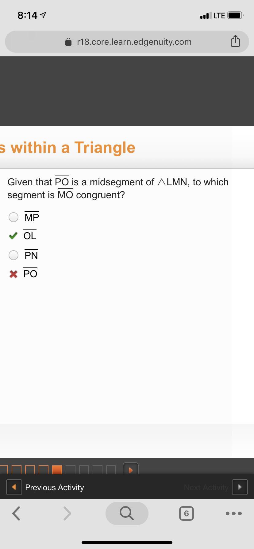 Given that PO is a midsegment of △LMN, to which segment is MO congruent?